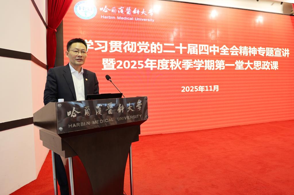 11月20日,学校举行学习贯彻党的二十届四中全会精神专题宣讲暨2025年度秋季学期第一堂大思政课,学校党委书记张学作专题宣讲,校长季勇主持宣讲会,副校长高彦辉全文传达《中国共产党黑龙江省第十三届委员会第八次全体会议决议》。