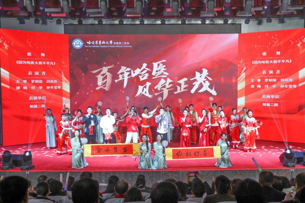 联欢会融合了歌舞、情景剧、诗朗诵等多种形式,展现了全校师生致敬学校百年荣光的赤诚之心和勇毅迈向新征程的昂扬风貌。附属二院的歌舞《因为哈医大而不平凡》精彩开场,拉开了演出序幕,随后《大东北是我的家乡》瞬间点燃了全场氛围。