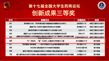 近日,由全国药学类院校大学生专业技术与实验技能竞赛组委会主办、海军军医大学承办的第十七届全国大学生药苑论坛在上海举行,共吸引来自北京大学、复旦大学、中国药科大学、哈尔滨医科大学等126所高校的279项作品同台竞技,参赛规模与质量双双创下历史新高。我校学子在激烈赛事中脱颖而出,斩获创新成果一等奖1项、创新成果二等奖1项、创新成果三等奖1项、优秀论文奖2项、优秀指导教师奖1项。