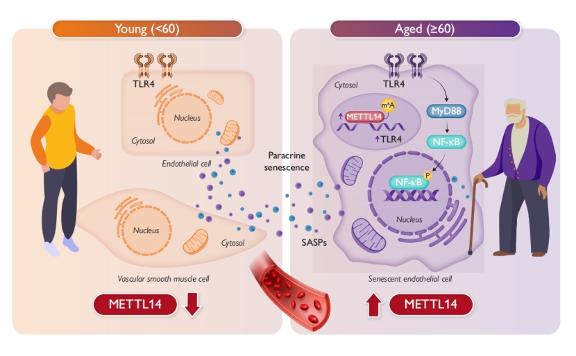 血管衰老表现为血管重构、硬化和组织衰老,是诱发高血压和血栓性疾病的主要病理基础,抑制血管衰老的干预靶标有待揭示。本研究创新性地揭示了甲基转移酶样蛋白14(METTL14)在血管衰老中的核心作用。研究发现,METTL14在衰老的人和小鼠主动脉内皮细胞以及多种衰老内皮细胞模型中均显著上调;通过构建内皮细胞特异性基因敲除/过表达METTL14小鼠模型及多种衰老模型(自然衰老、D-半乳糖诱导),证明内皮细胞METTL14缺失可显著改善血管硬化、血管重构和内皮衰老。机制上首次阐明METTL14通过促进Toll样受体4(TLR4)mRNA的m6A修饰增强其稳定性,介导衰老相关分泌表型(SASPs)的生成;临床研究发现,人血液中METTL14和TLR4水平升高与血管衰老及动脉粥样硬化和动脉硬化的发生呈正相关。