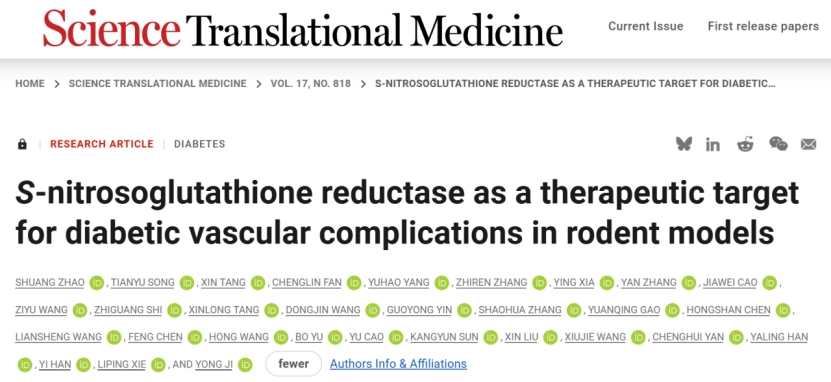 近日,我校寒地心血管病全国重点实验室季勇教授团队在国际权威期刊Science Translational Medicine上发表题为《S-nitrosoglutathione reductase as a therapeutic target for diabetic vascular complications in rodent models》的研究论文。该研究首次揭示亚硝基谷胱甘肽还原酶(GSNOR)通过非酶活依赖的方式参与糖尿病血管并发症的新机制,并创新性研发了口服小分子化合物NYY-001,可通过靶向GSNOR改善糖尿病血管内皮功能障碍。该研究不仅为理解糖尿病血管并发症的分子机制提供了新视角,也为临床治疗提供了具有转化潜力的新候选药物。