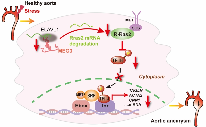 Ras信号是整合素与TGFβ信号转导通路下游的关键节点,其是否能够影响血管平滑肌细胞表型转化并参与主动脉瘤,目前尚不清楚。本研究基于腹主动脉瘤患者血管组织及动物样本,通过多组合联合分析进一步筛选发现RRAS2是参与主动脉瘤相关平滑肌表型转化的核心基因。而平滑肌特异性敲除RRAS2可促进平滑肌表型转化,从而加重腹主动脉瘤的发生。进一步机制研究表明,RRAS2介导c-Met依赖的转录因子TFII-I的磷酸化及核转位,激活平滑肌收缩相关基因的转录表达,进一步研究发现长链非编码RNAMEG3通过抑制Rras2mRNA降解,维持血管平滑肌细胞稳态,延缓腹主动脉瘤的进展。研究成果为临床干预提供了具有重要转化价值的新策略。