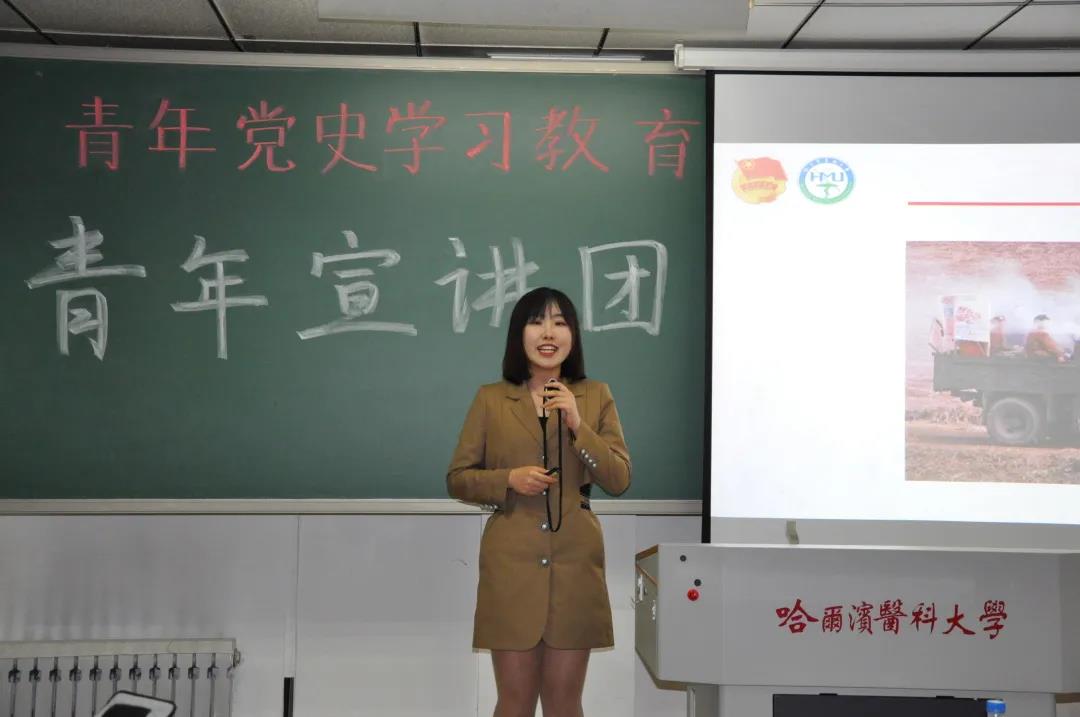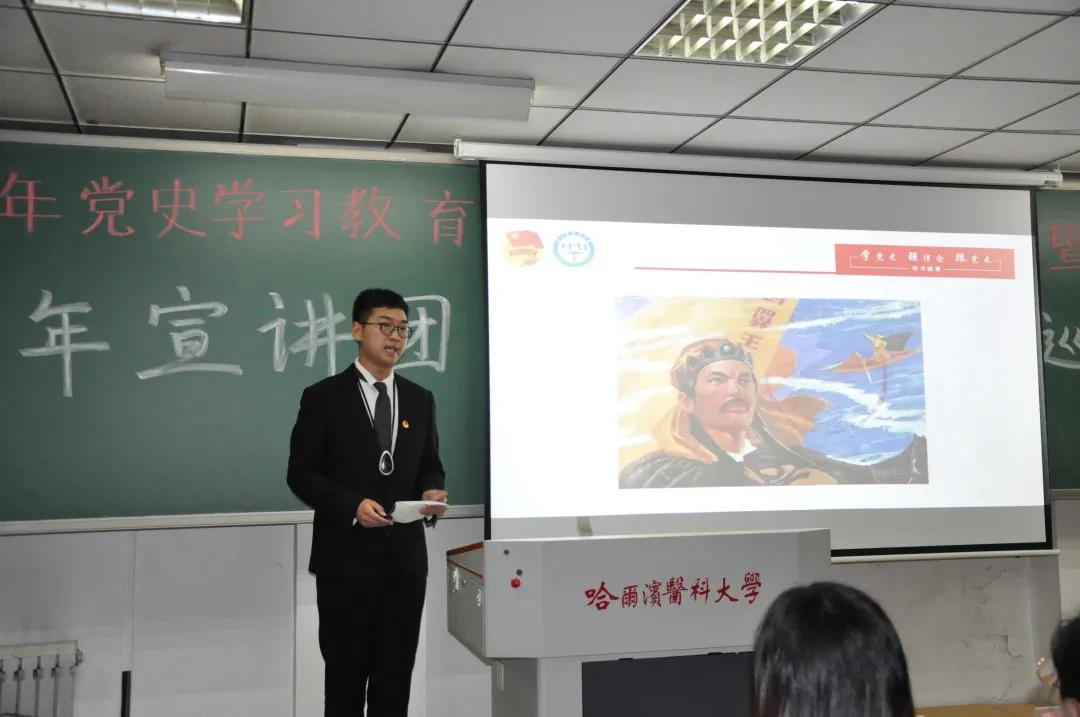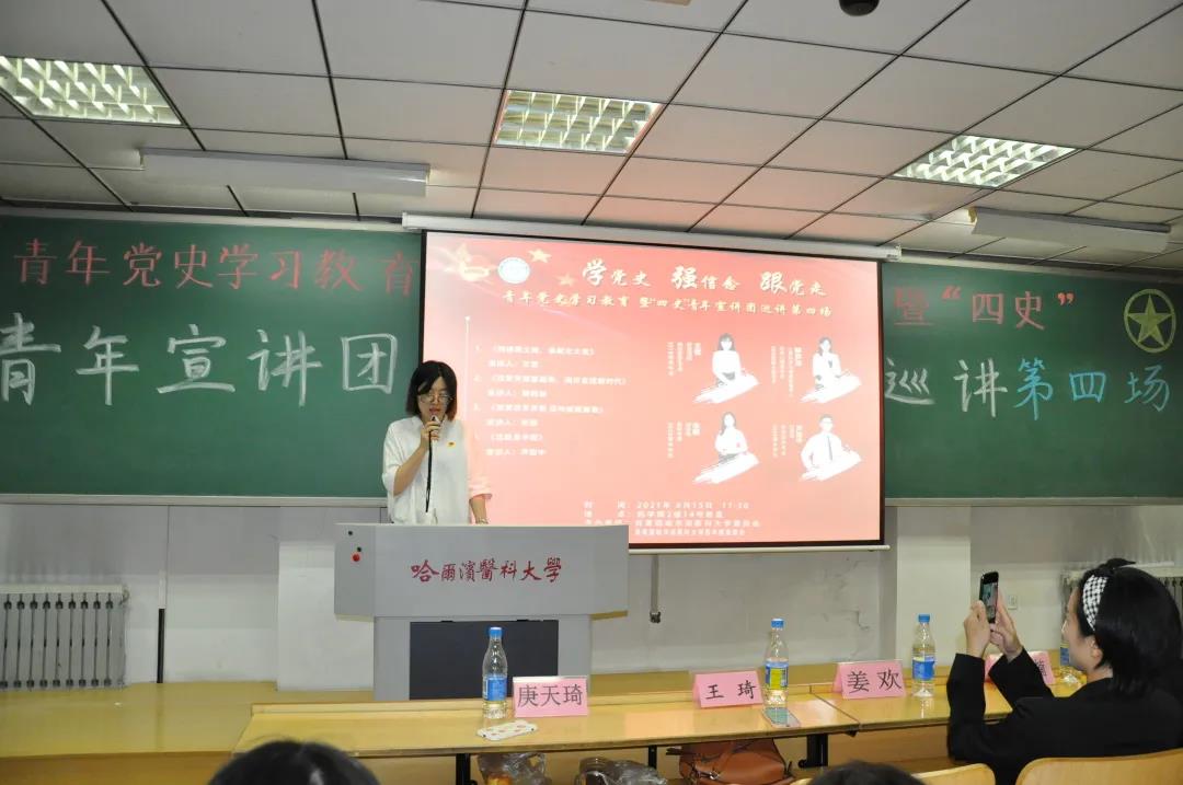 为庆祝建党一百周年,学习贯彻习近平新时代中国特色社会主义思想,从我党百年来辉煌发展历程中汲取智慧和奋进力量,结合学习四史重要指示要求,6月15日,药学院特邀校“四史”青年宣讲团开展第四场巡回宣讲。学院有幸邀请到王雪、谢韵加、张丽、芦俊中四位青年宣讲团代表前来宣讲,为同学们讲述恢宏壮阔的百年党史。校团委宣讲团指导教师姜欢、苗新秀楠参加本次宣讲活动,药学院团委书记王琦、研究生团总支书记张广明,本科生团总支书记庚天琦以及100余名学生代表聆听了本次讲座。