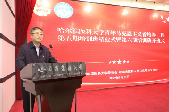 校党委副书记袁重胜讲话,他指出:实施“青年马克思主义者培养工程”是为了传承党用马克思主义理论武装青年的优良传统,让新时代的新青年理解“中国共产党为什么能,中国特色社会主义为什么好,归根结底是因为马克思主义行”。正如习近平总书记所指出的“青年一代有理想、有本领、有担当,国家就有前途,民族就有希望。中华民族伟大复兴的中国梦终将在一代代青年的接力中变为现实。” “青马工程”培训项目肩负着为党培养优秀人才、延续革命圣火、传承红色基因的重要使命。自团中央启动实施“青年马克思主义培养工程”以来,学校团委积极按照团中央、全国学联的部署及要求,把实施“青马工程”作为一项重要的政治任务常抓不懈。他向第六期全体学员提出殷切期望:希望同学们一能充分认识青年马克思主义者培养工程的重大现实意义和战略意义;二能珍惜宝贵的学习机会圆满完成本次培训班的各项学习任务,拓展综合实践能力;三能坚持理论联系实际,切实提高履行职责的能力和水平;四能以“青马工程”为新起点,创造一番不凡的青春作为。祝福哈医学子成为坚定的青年马克思主义者,传承无产阶级革命先辈的志向与精神,以优异成绩迎接党的二十大召开。