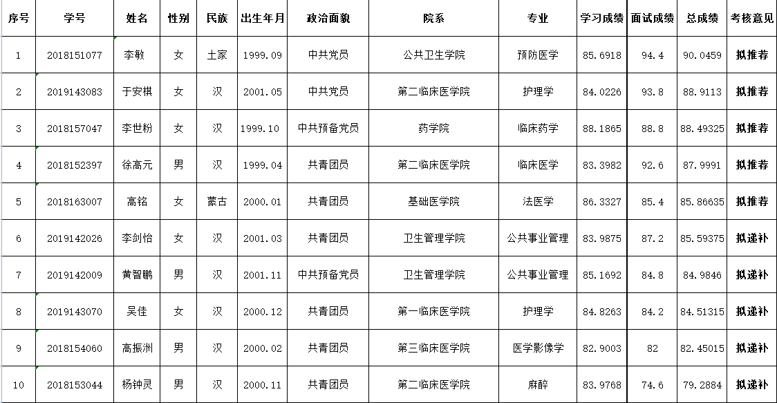 拟推荐人员如出现体检不合格或自动放弃的情况,顺次替补。