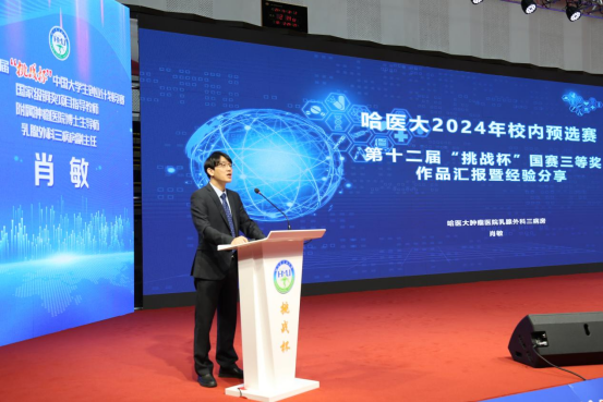 大会现场播放了本届挑战杯的宣传视频。哈尔滨医科大学附属第一医院的学生代表为现场观众表演了“挑战杯”黑龙江省主题曲《青春一起挑》。附属肿瘤医院乳腺外科三病房副主任肖敏、附属第四医院核医学副研究员韩兆国老师作为往届国赛获奖项目指导教师代表发言。附属第二医院2022级博士研究生张智桦、附属第一医院2020级本科生刘双伊作为往届国赛获奖项目学生代表发言。