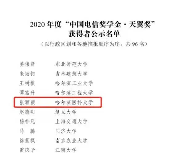 由共青团中央、中国电信集团有限公司、全国学联联合开展的2020年度“中国电信奖学金”遴选工作已经收尾,获得者名单现已公布,我校第二临床医学院2017级临床医学(“5+3+X”一体化)于维汉班张颖颖荣获“中国电信奖学金·天翼奖”。