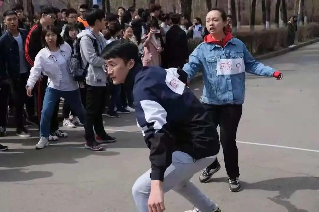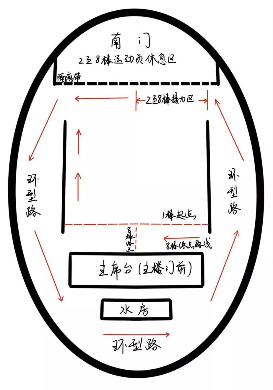 环校接力赛采用男女运动员交替接力的形式进行,第一棒的女生在主楼门前的主席台起跑,行至校南门标志点后向左转弯,然后逆时针环绕校园进行接力竞赛,第八棒的男生于主楼西侧拐弯至主楼门口起点处完成比赛。