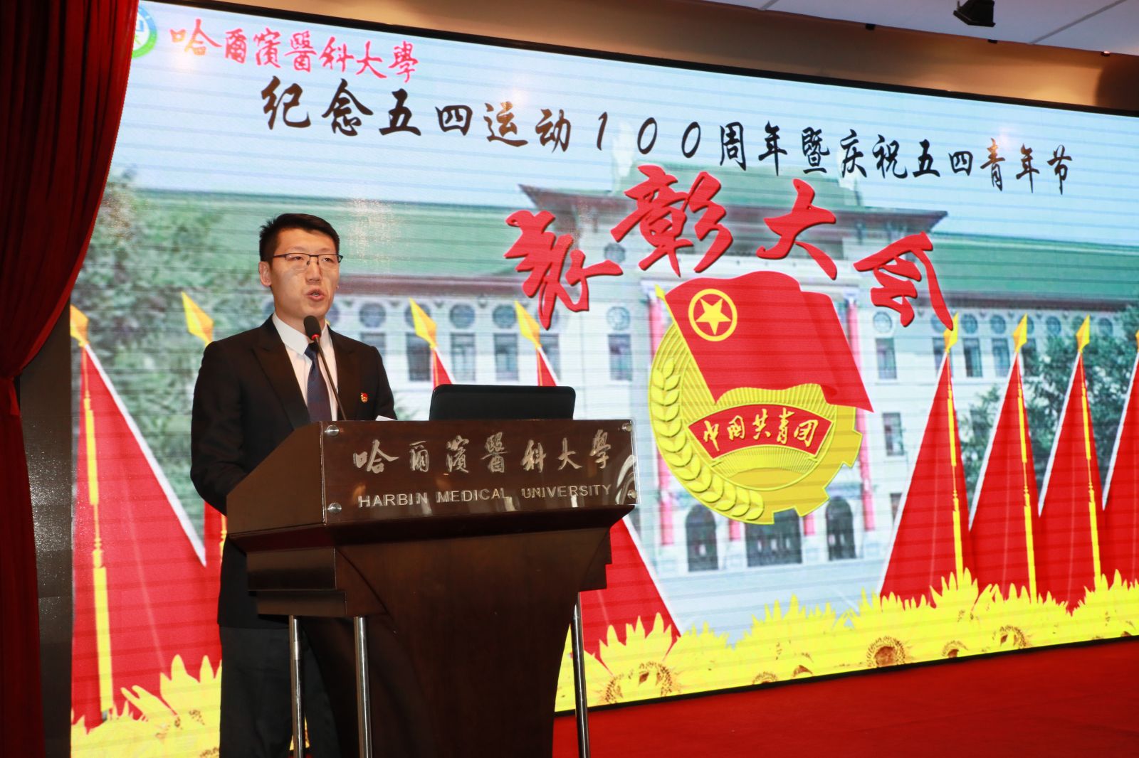 首先,学校党委副书记袁重胜宣读了关于表彰哈尔滨医科大学第四届“青年五四奖章”、第十二届“十佳大学生”和2019-2020年度校“两红两优”先进集体及个人的决定。然后,第22届黑龙江省“青年五四奖章”获得者,黑龙江省首批援鄂医疗队队员,哈医大二院心内科病区副主任邢磊进行大会发言,他说:我们这支30人的“心脏尖兵团”,全部是由80、90后的青年们组成,在哈医大团委的指导下,广大团员青年忘我工作,凸显了青春的力量,代表黑龙江青年一代医务工作者交出了合格的答卷。2019年度全国“优秀共青团员”获奖者,黑龙江省首批援鄂医疗队队员,哈医大二院重症医学科D区护士王东博进行大会发言,他说:在医疗队临时党支部、校团委及各院团委的带领下,临时团支部成员坚决贯彻落实校院工作部署,严于律己,以身作则,沉着冷静,科学合理的落实各项医疗救护工作。在医疗工作中,不畏艰险,冲锋在前,充分发挥了生力军和先锋队的作用。彰显了黑龙江青年的力量,为武汉,为家乡,向祖国交出了令人民满意的答卷。校第十二届“十佳大学生”获奖代表,基础医学院2018级临床医学5+3专业邓力文进行大会发言,他说:专业的医学知识,严谨的治学态度,多彩的校园生活,幽静的校园环境,多样的发展机会,医大就像是一片舞台,任我不断尝试、体验、发掘自己的潜力。发言代表们都表示要传承弘扬“爱国、进步、民主、科学”的五四 精神,不忘跟党初心,牢记青春使命,坚定信念、志存高远、矢志奋斗,为学校的发展和祖国医药卫生事业的建设做出新的贡献!