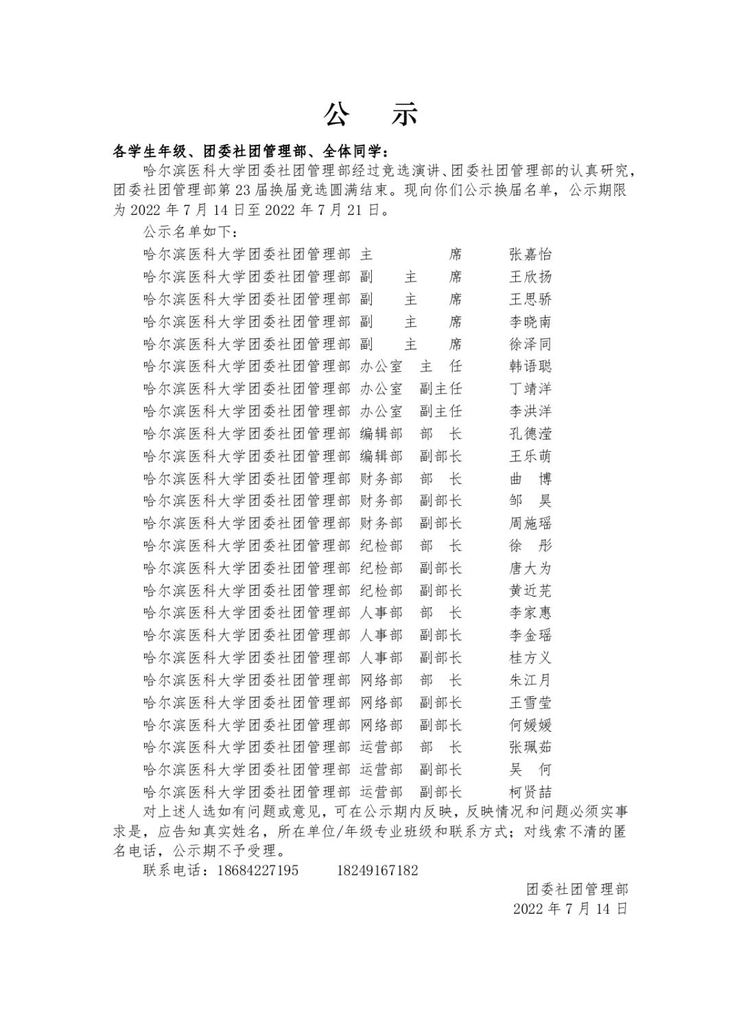 哈尔滨医科大学团委社团管理部经过各部门认真研究,现已向校团委提交换届申请,换届流程符合程序要求,主席团候选人资格审查通过,根据相关文件要求,现予以公示。