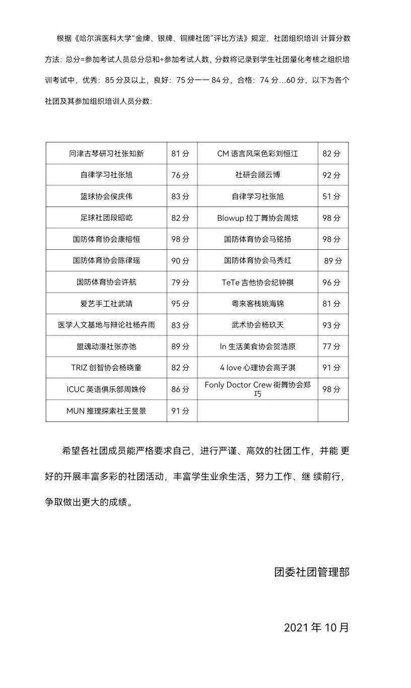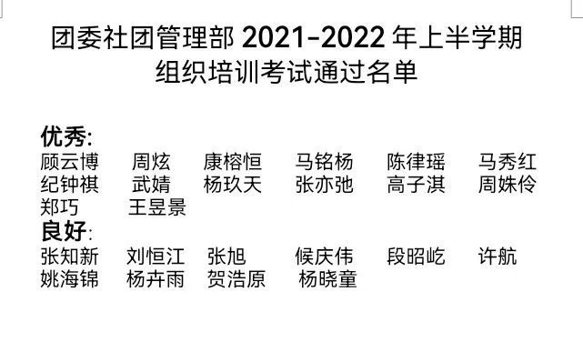 团委社团管理部三次组织培训到这里就告一段落了,相信经过这三次组织培训及考试,大家对我们这个大家庭也有了更深的了解并渐渐融入其中。恭喜名单上的同学顺利通过了组织培训考试!