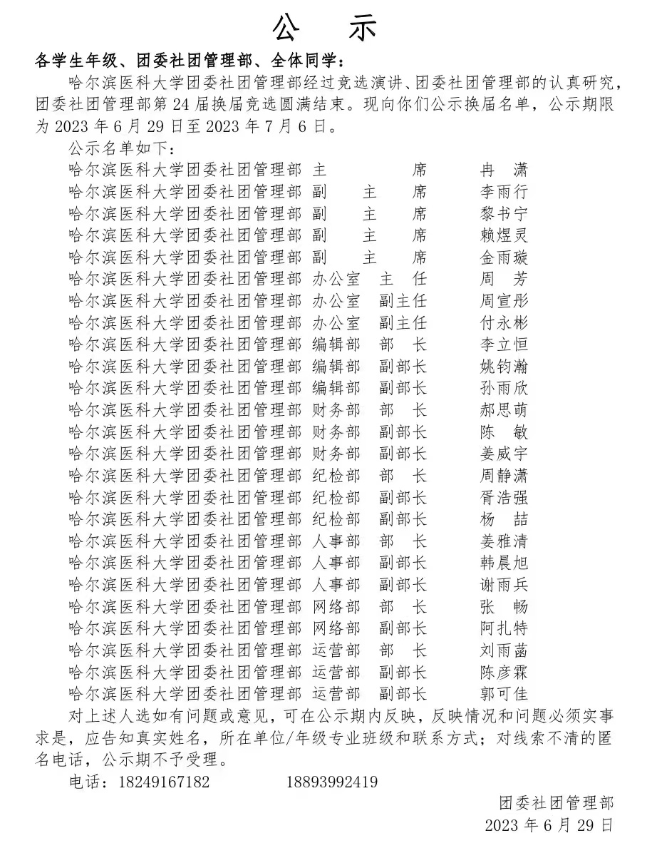 哈尔滨医科大学团委社团管理部经过各部门认真研究,现已向校团委提交换届申请,换届流程符合程序要求,主席团候选人资格审查通过,根据相关文件要求,现予以公示。