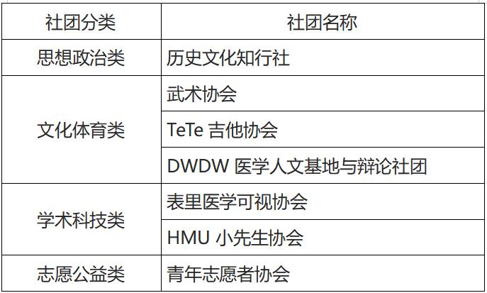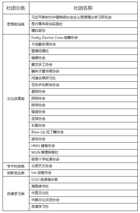 本次年审共有7个学生社团审查结果为优秀,允许继续注册,其中思想政治类:1个;文化体育类:3个;学术科技类:2个;志愿公益类:1个。名单如下: