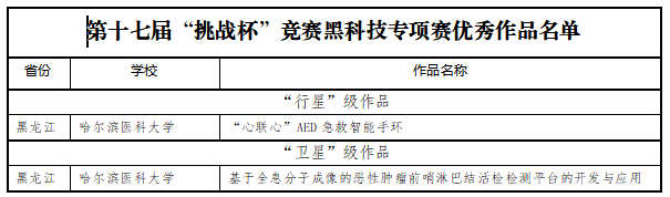 日前,我校哈医大附属二院团队《“心联心”AED急救智能手环》和哈医大附属肿瘤医院团队《基于全息分子成像系统的恶性肿瘤前哨淋巴结活检检测平台的开发与应用》两个作品在第十七届“挑战杯”全国大学生课外学术科技作品竞赛“黑科技”专项赛终审决赛中,分别荣获“行星级”和“卫星级”称号。