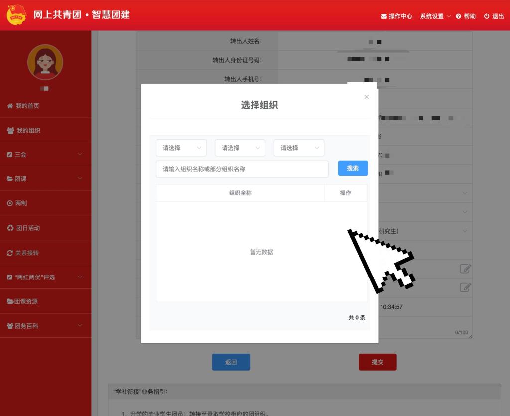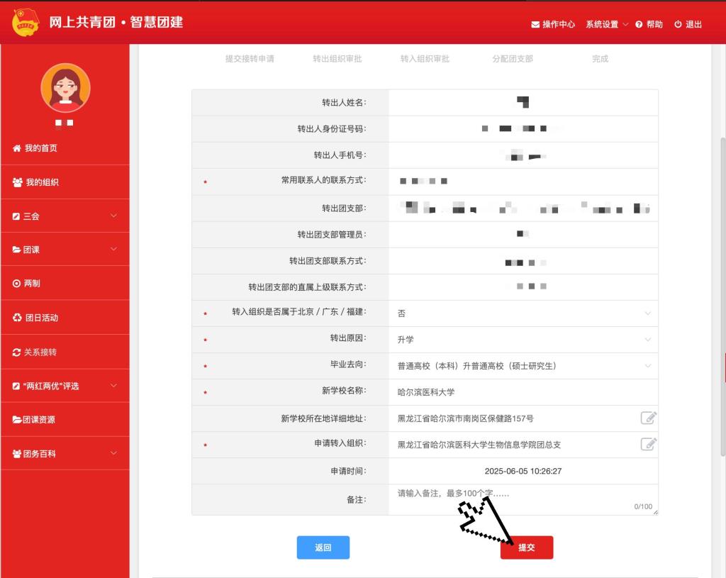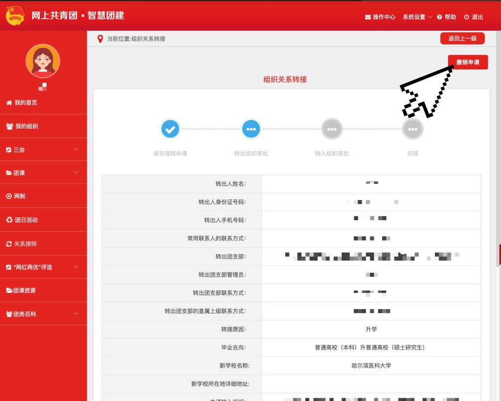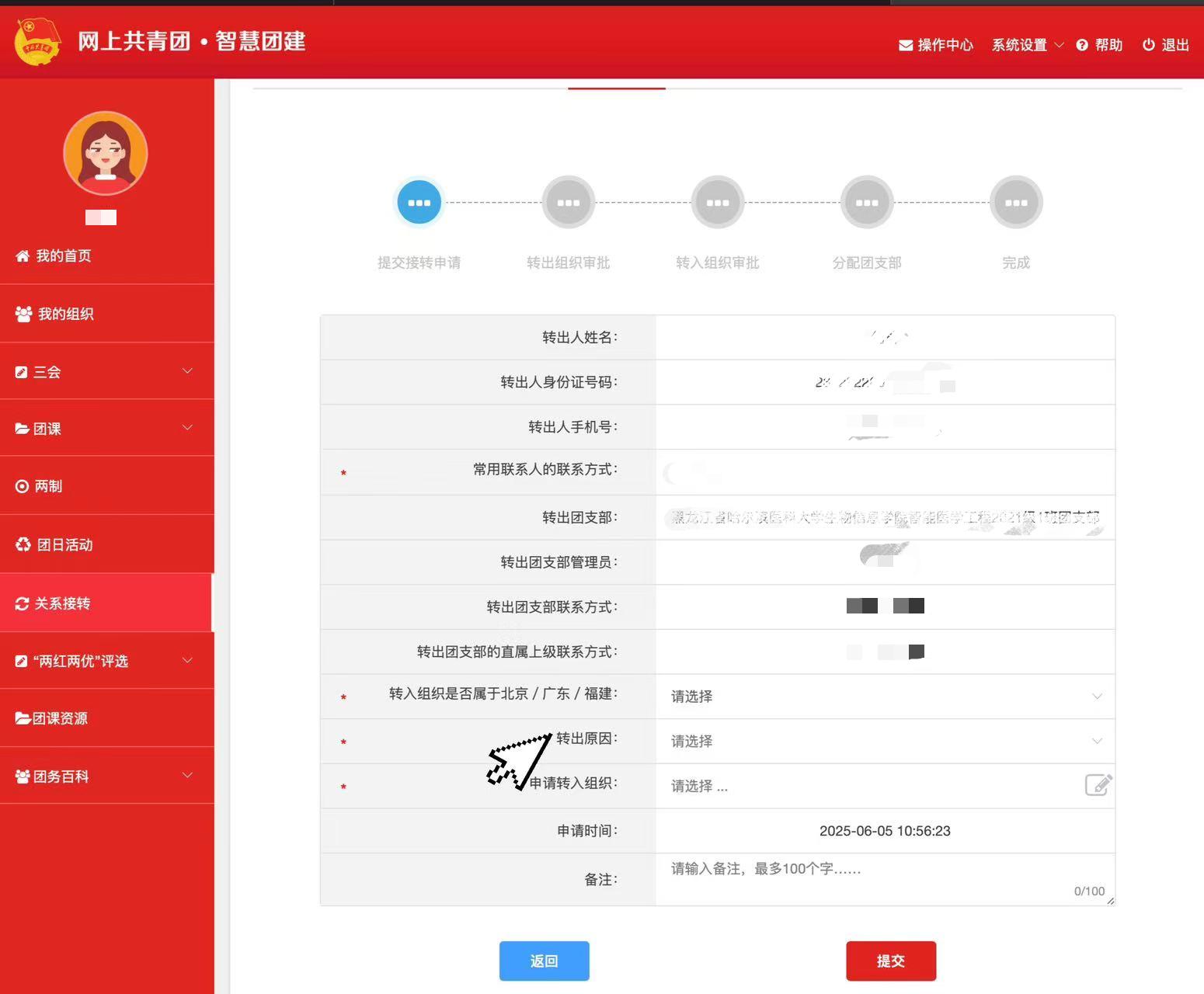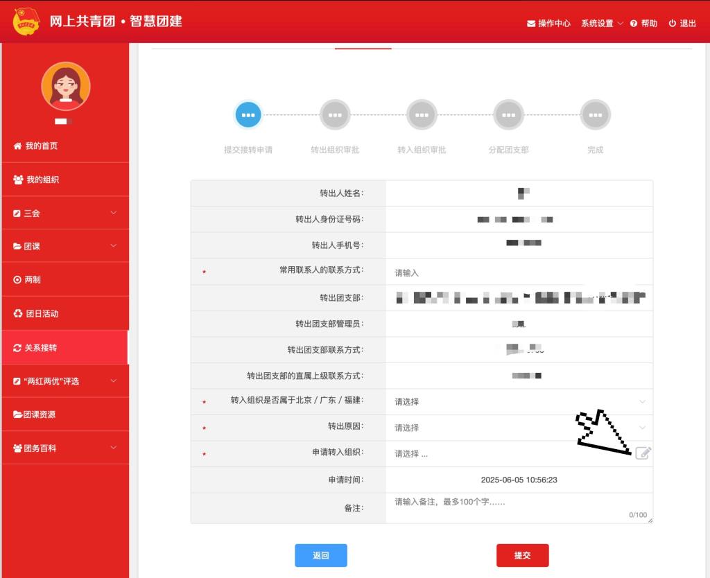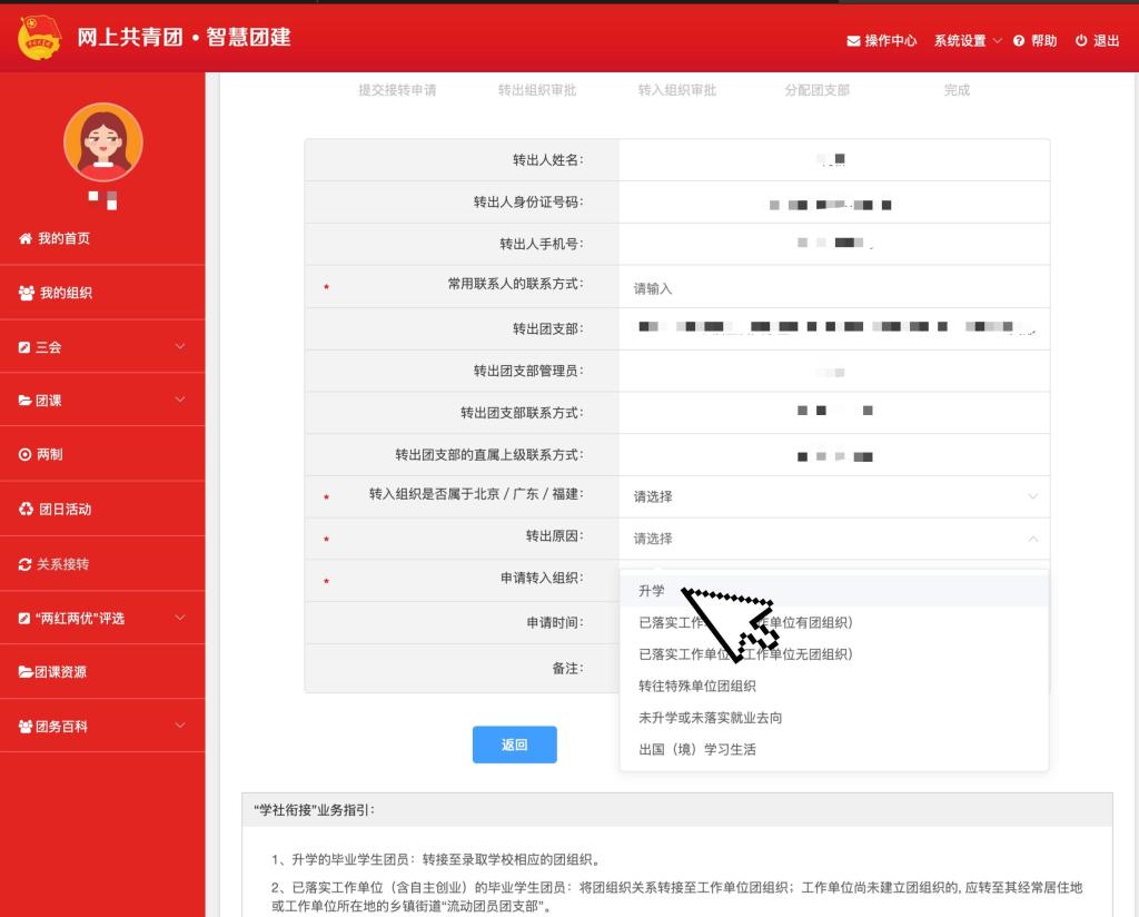 【注】①转入组织若为北京/广东/福建,须明确转入团组织在北京/广东/福建系统内的组织全称,并在发起业务界面准确无误地填写转入团组织名称。并在发起转接后的一周内在相应系统注册账号②转出原因:升学、工作、搬迁、转往特殊单位团组织与其它。