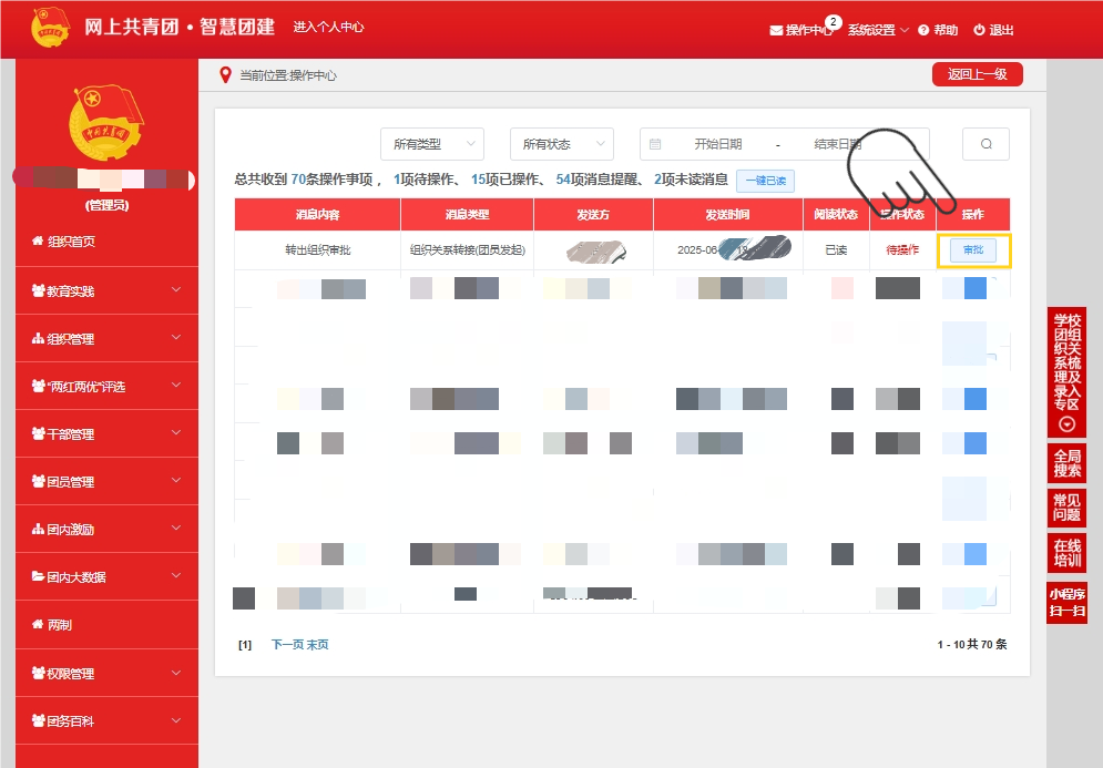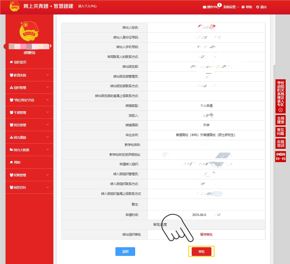 (2)进入此界面后,点击团员信息右侧进行操作“审批”。