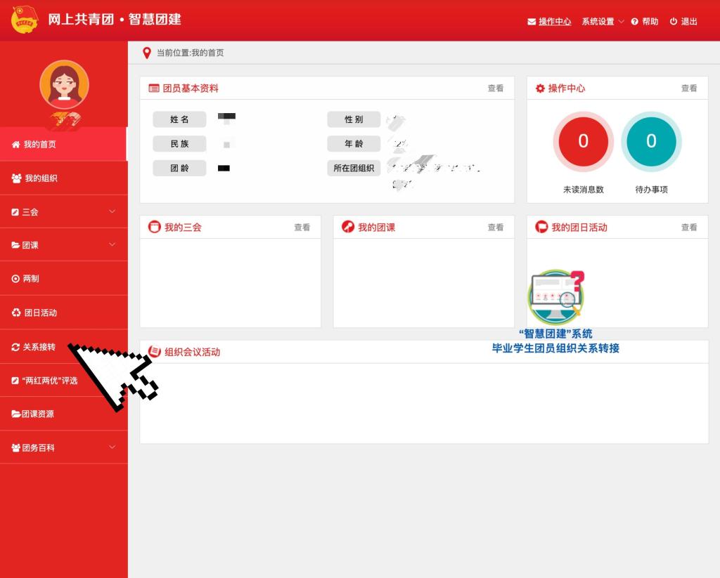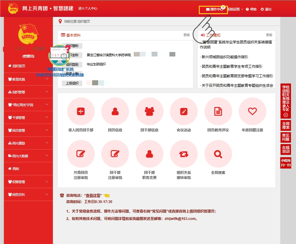 (1)同上述流程进入智慧团建系统,点击右上角“操作中心”,查看团组织信息。