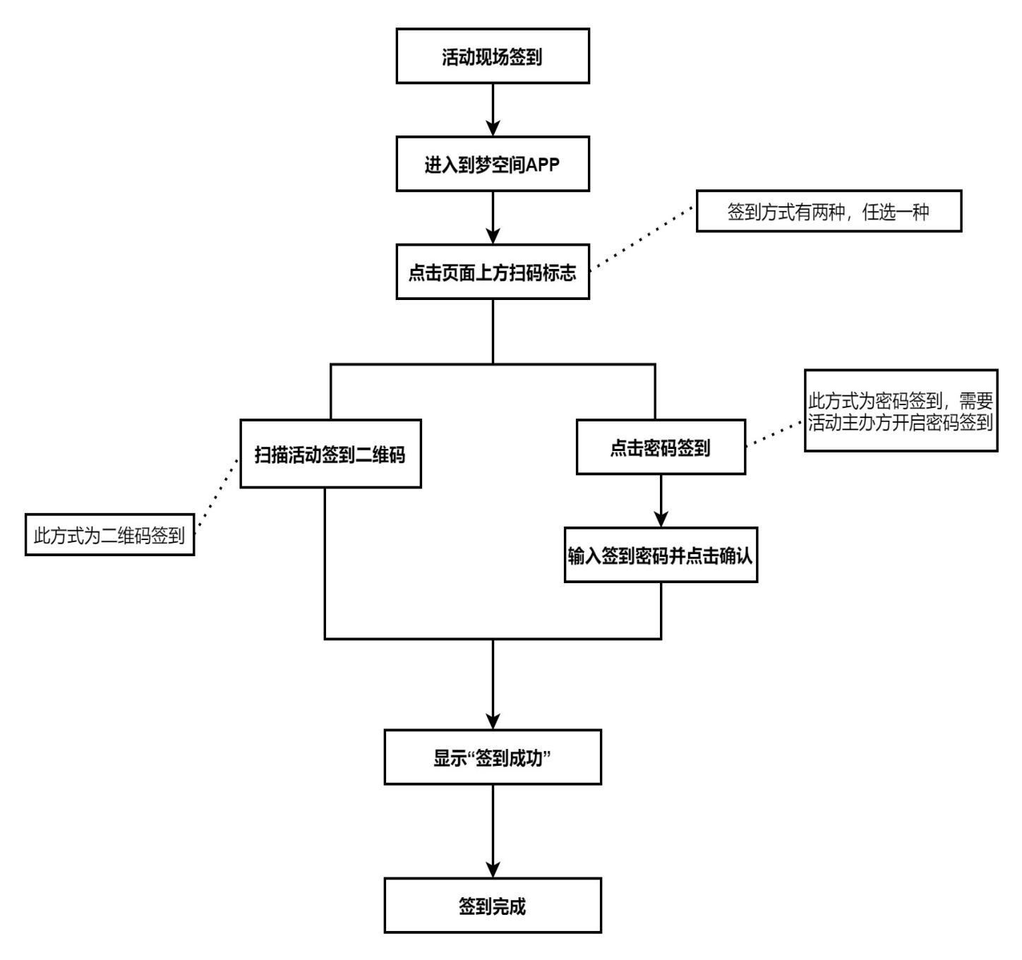 第十六条 活动签到。如果活动报名成功,需要参加活动并签到,活动参与方 式可咨询活动主办方;签到需要在到梦空间APP 端进行,有扫码签到和密码签 到两种方式。通过扫码签到,点击首页右上角“扫码标志 ”进入扫码页面,扫描 活动主办方提供的签到二维码完成签到;通过密码签到,点击首页右上角“扫码 标志”进入扫码页面,点击“密码签到”进入签到页,输入活动主办方提供的签到 密码,点击“确定”显示“签到成功”即可完成签到。若参加活动的同学出现不可 避免的无法签到的情况,活动负责人或组织者可进行补签。活动签到时间默认为 活动开始到活动结束,签到时间可由活动主办方修改。应注意签到二维码及签到密码的时间和地点限制。