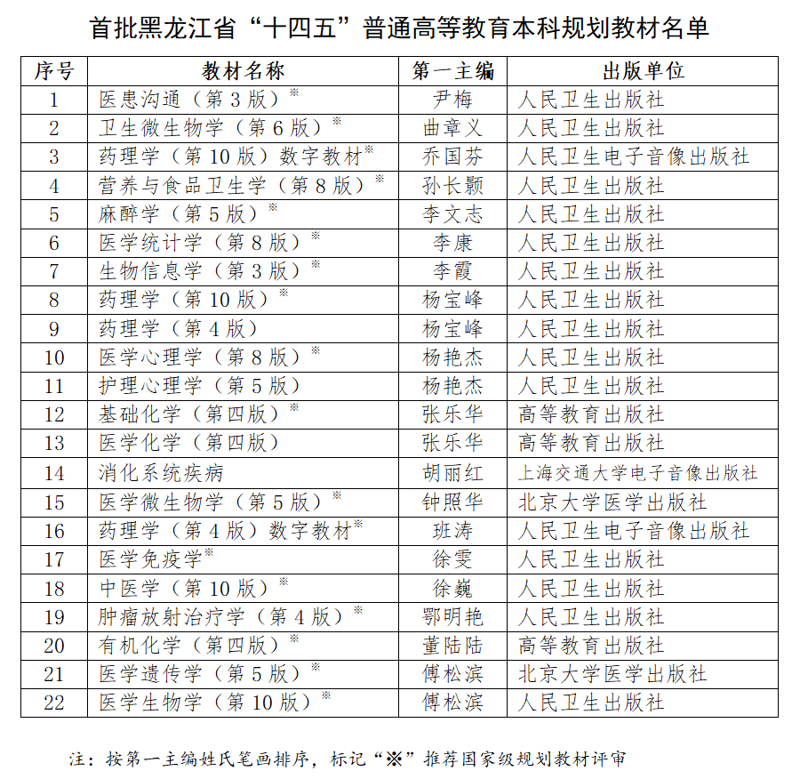 近日,黑龙江省教育厅公布首批黑龙江省“十四五”普通高等教育本科规划教材名单,我校共有22部教材入选,其中18部教材被推荐申报“十四五”普通高等教育本科国家级规划教材。