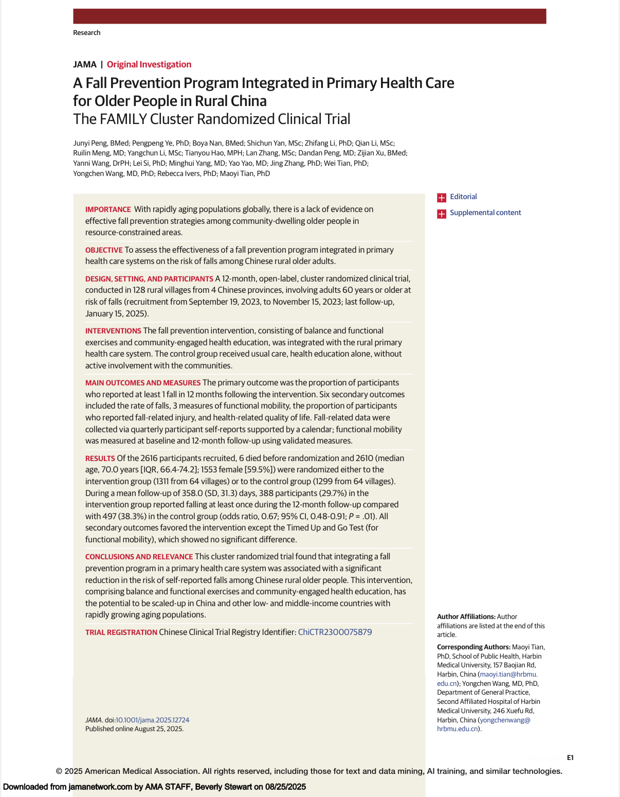 8月25日,由哈尔滨医科大学公共卫生学院副院长田懋一教授与哈尔滨医科大学附属第二医院全科医学学科带头人王永晨教授领衔的研究团队,联合多省疾病预防控制中心和医学院校,完成了一项重要的整群随机对照试验,相关研究成果在线发表于国际著名医学期刊《美国医学会杂志》(JAMA)。研究成果为筑牢乡村振兴的“健康基石”提供了可广泛适用的“中国方案”。