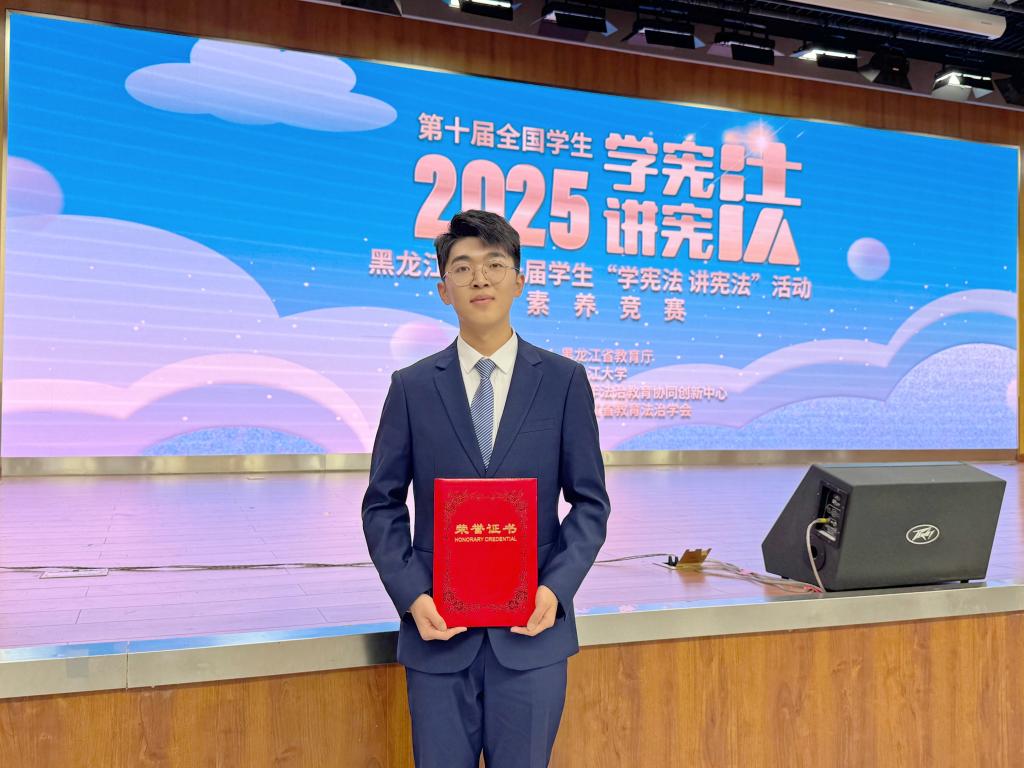 10月18日,在刚刚落幕的第十届全国学生“学宪法讲宪法”活动黑龙江省赛区总决赛的舞台上,来自人文社会科学学院法学专业的学子们不负众望,斩获奖项。在演讲、素养与法治情景剧三大赛道的激烈角逐中,我校代表队凭借扎实的专业基础、出色的综合素养与稳定的临场发挥,荣获个人一等奖2项、二等奖1项,团体二等奖1项,全面展现了法学专业学生“明法笃行、德法兼修”的精神风貌,为学校赢得了广泛赞誉。