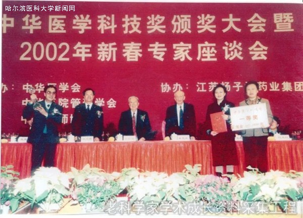 中华医学科技奖颁奖大会暨2002年新春专家座谈会上,夏求明领取中华医学科技奖一等奖领奖现场照片