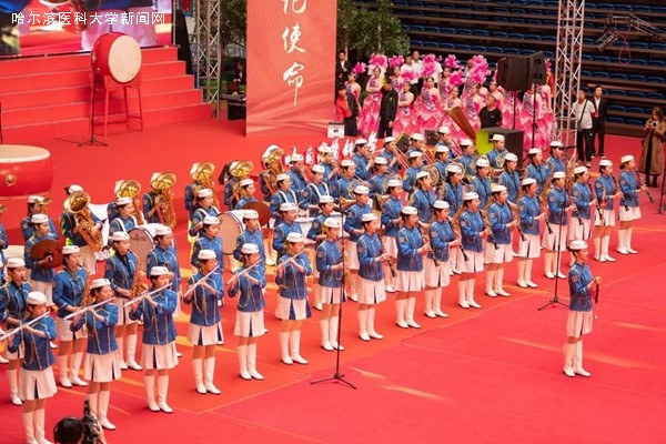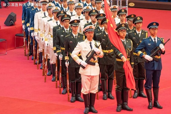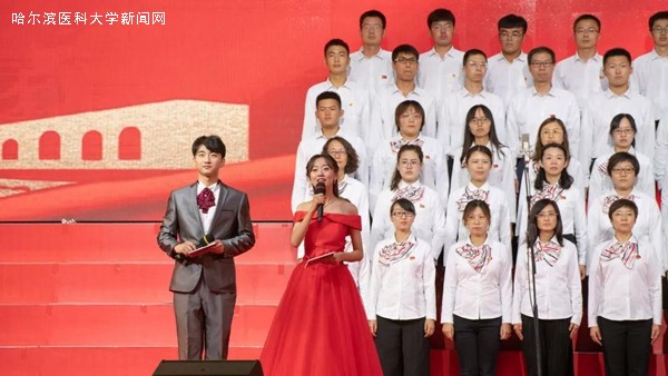 150名身着白服的学工部代表队的医学本科生高唱《红旗颂》,表达了新时代哈医大学子传承红色基因、科学基因、开放基因的赤子之心。